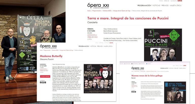 Por décimo año consecutivo, hemos tenido el honor de colaborar con la prestigiosa Asociación de Amigos de la Ópera de Vigo, una institución con más de 60 años de historia que organiza anualmente su temporada lírica. Nuestra colaboración abarca la creación integral de la línea gráfica de comunicación para su temporada, incluyendo:Diseño y gestión de redes sociales y web.Gestión de comunicación con socios y mediosDiseño y producción de elementos gráficos: vinilos, lonas, rollups, mupis, programas de mano...Nuestro enfoque se ha centrado en desarrollar campañas de alto impacto, especialmente diseñadas para redes sociales, con el objetivo de atraer nuevas audiencias y mantener el prestigio de esta institución lírica. Hemos creado diseños que reflejen fielmente la visión de cada producción, logrando una concordancia entre la comunicación visual y la puesta en escena.